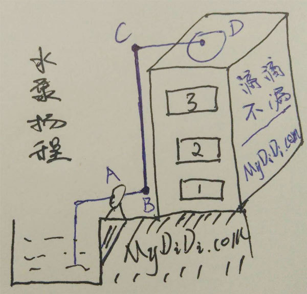簡單說明一下草圖:要將水池中的水輸送到三樓樓頂,A標(biāo)識為水泵,數(shù)字123代表所在樓層,結(jié)合本圖,在理想狀態(tài)下,水泵揚程可以簡單理解為點B到C的垂高,單位通常是米,這個就是水泵揚程。