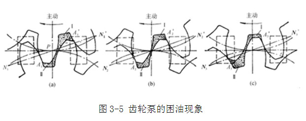 齒輪油泵要能連續(xù)地供油,就要求齒輪嚙合的重疊系數(shù)ε大于1,也就是當(dāng)一對齒輪尚未脫開嚙合時,另一對齒輪已進(jìn)入嚙合,這樣,就出現(xiàn)同時有兩對齒輪嚙合的瞬間,在兩對齒輪的齒向嚙合線之間形成了一個封閉容積,一部分油液也就被困在這一封閉容積中〔見圖3-5(a)〕,齒輪連續(xù)旋轉(zhuǎn)時,這一封閉容積便逐漸減小,到兩嚙合點處于節(jié)點兩側(cè)的對稱位置時〔見圖3-5(b)〕,封閉容積為最小,齒輪再繼續(xù)轉(zhuǎn)動時,封閉容積又逐漸增大,直到圖3-5(c)所示位置時,容積又變?yōu)樽畲蟆T诜忾]容積減小時,被困油液受到擠壓,壓力急劇上升,使軸承上突然受到很大的沖擊載荷,使泵劇烈振動,這時高壓油從一切可能泄漏的縫隙中擠出,造成功率損失,使油液發(fā)熱等。當(dāng)封閉容積增大時,由于沒有油液補充,因此形成局部真空,使原來溶解于油液中的空氣分離出來,形成了氣泡,油液中產(chǎn)生氣泡后,會引起噪聲、氣蝕等一系列惡果。以上情況就是齒輪泵的困油現(xiàn)象。這種困油現(xiàn)象極為嚴(yán)重地影響著泵的工作平穩(wěn)性和使用壽命。