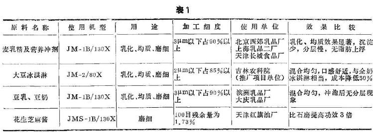 在食品工業(yè)軋各種果醬、果汁、 奶、豆乳粉、雪糕、冰祺淋、大巨蛋白、蛋黃醬、蔬菜醬、蔬菜汁、豆餡、蓮蓉、調(diào)味匯 再制奶、人造黃油、蜂漿、麥乳精、 劑、花生奶、食品乳狀液、花粉海藻、魚肉泥、花生芝麻醬等,經(jīng)過膠體磨超微粉碎后,獲得了理想的混合、均質(zhì)、乳化和磨細(xì)效果,提高了其經(jīng)濟(jì)介值和營養(yǎng)價(jià)值。表[ 為部分典型原料加工表。 在良品加工過程中:應(yīng)用膠體磨處理各種剩余下腳料進(jìn)行綜合利用:制酒果皮經(jīng)膠體磨加工成種果醬;肉制品下腳料可加工成各種肉松多粉制品下腳料可重新利用或制做工業(yè)漿糊。各種蔬菜籽、棉籽仁粉碎后經(jīng)膠體磨超微粉碎、脫脂后提取營養(yǎng)素等,其主要加工設(shè)備都離不開膠體磨。近年來, 些科研部門利用超微加工后,提取植物高蛋白制做各種化妝用品,提高化妝品應(yīng)用價(jià)值,也取得了可喜成果。 在食品加工業(yè)推廣使用膠體磨有著遠(yuǎn)的經(jīng)濟(jì)意義。它是食品工業(yè)最優(yōu)的加工設(shè)備,適于對各種乳液、膏狀物和含有一定液體的物料加工,比一切攪拌機(jī)、粉碎機(jī)效果提高2、5倍,能耗降低40、60%。
