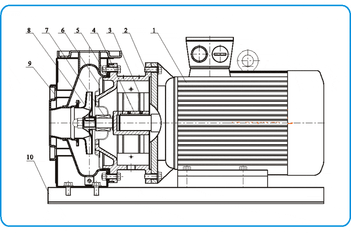 ZS型不銹鋼臥式單級離心泵為泵軸直聯(lián)型聯(lián)結,由泵、泵軸和標準電機組成: