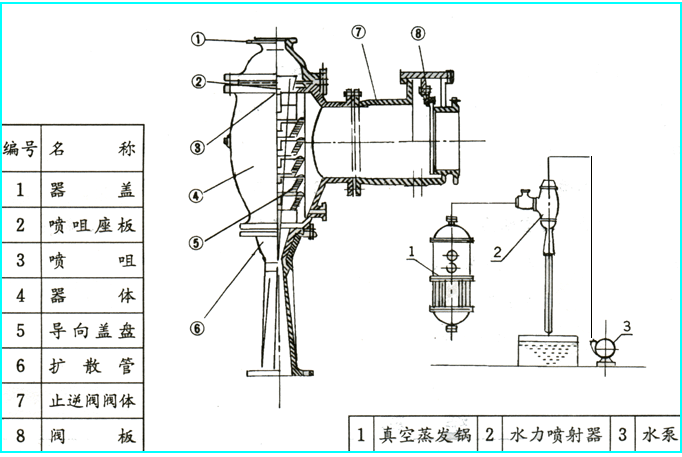 水力噴射器由器體、器蓋、噴咀、噴咀座板、導(dǎo)向盤、擴(kuò)壓管及單向閥等部件組成,噴咀用不銹鋼制造,噴咀座板由優(yōu)質(zhì)鋼加工,其余零件則系鑄鐵鑄造。噴咀采用多噴咀的結(jié)構(gòu)形式,以便得到較大的水—汽接觸,有利于熱交換的進(jìn)行,獲得較好的真空效果。噴咀座板加工精密,精度較高,以使噴射水流準(zhǔn)確地聚集在同一的焦點(diǎn)。導(dǎo)向盤用于減慢蒸汽(或空氣)的流速,使蒸汽均勻地導(dǎo)入器室以免噴射水流偏斜,降低抽射效能。整個(gè)裝置結(jié)構(gòu)緊湊精密,強(qiáng)度高,用于真空蒸發(fā)系統(tǒng)中,由于能把冷凝器的冷凝作用與真空泵的抽氣作用合并在一個(gè)設(shè)備中同時(shí)完成,大大地簡化了工藝流程,比之原來真空泵加舊式冷凝器的裝置,可以節(jié)省去真空泵、冷凝器、分水器等設(shè)備,并且還有下列優(yōu)點(diǎn):