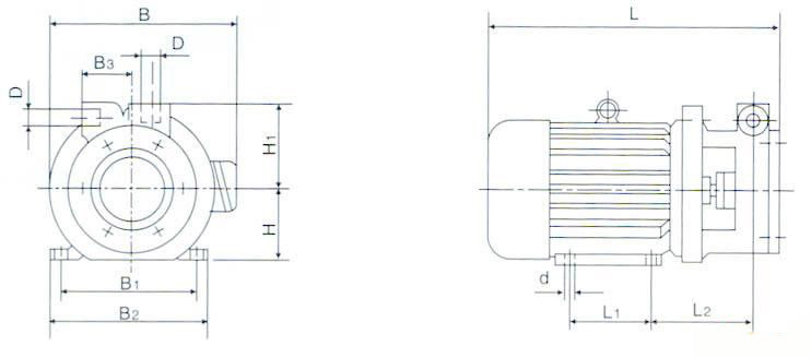 | 泵型號 | 配用電機(jī)型號 | L | L1 | L2 | B | B1 | B2 | B3 | H | H1 | D | d |