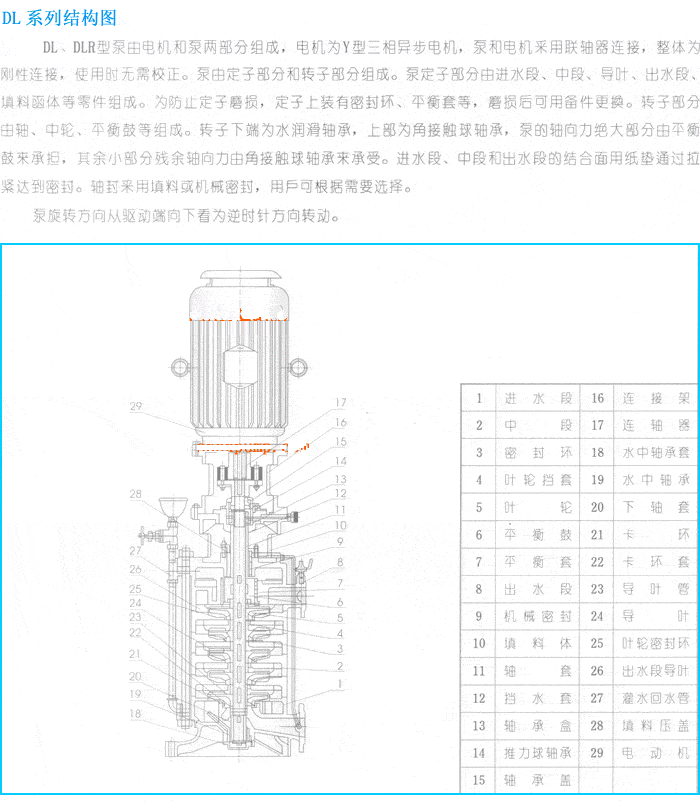 DL型立式多級離心泵是采用國家推薦使用的高效節(jié)能產(chǎn)品IS型泵的水力模型,為立式多級多節(jié)段式結(jié)構(gòu)。螺桿把進(jìn)水段、中段、出水段夾緊聯(lián)成一體。水泵每一級裝一個葉輪、一個導(dǎo)水葉。軸向力采用水力平衡法解決,殘余軸向力由球軸軸承承受,用油脂潤滑。軸封采用軟填料或機(jī)械密封。產(chǎn)品執(zhí)行JB/T2727-93《立式多級離心泵型式與基本參數(shù)》標(biāo)準(zhǔn),主要供吸送稀釋的、清潔的、不腐蝕的、不爆炸的清水及物理化學(xué)性質(zhì)類似水的不含固體顆粒或纖維的液體。