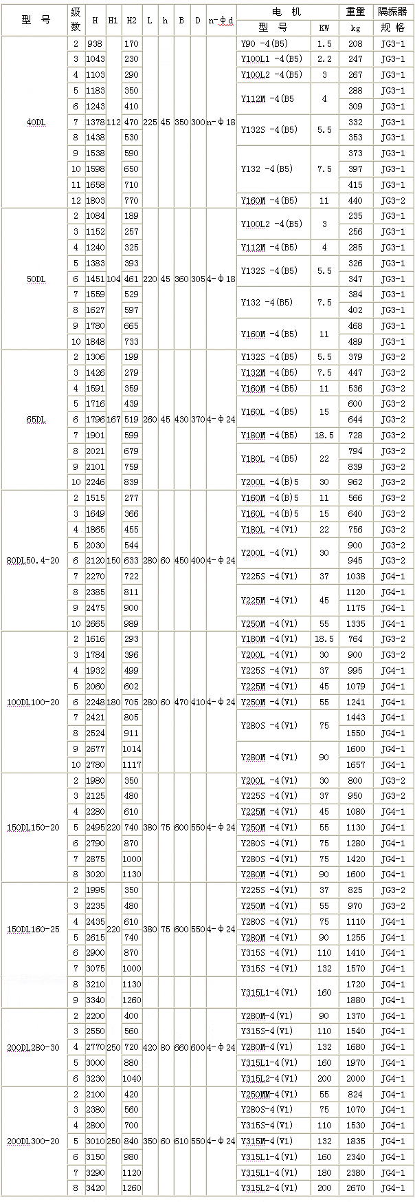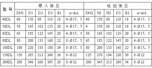 DL型立式多級離心泵法蘭安裝尺寸表: