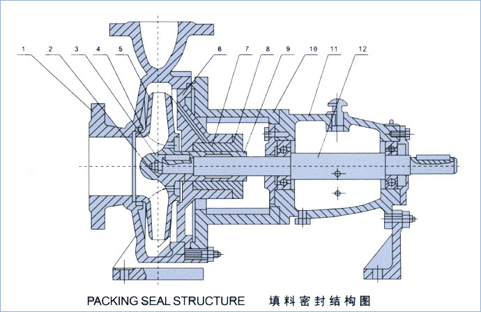 1、泵體2、葉輪螺母3、止動墊圈4、密封環(huán)5、葉輪6、泵蓋7、填料8、填料壓蓋9、軸套10、中間托架11、懸架12、泵軸
