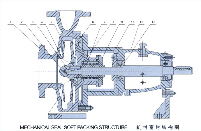 1、泵體2、葉輪螺母3、止動墊圈4、密封環(huán)5、葉輪6、泵蓋7、機(jī)械密封8、填料壓蓋9、軸套10、中間托架11、懸架12、泵軸
