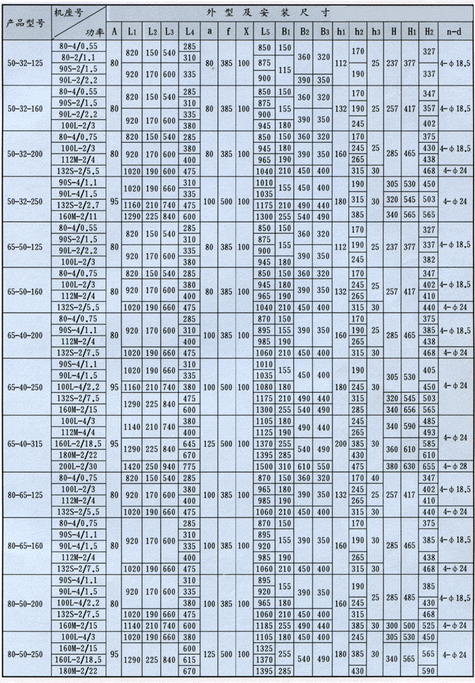 型號 轉(zhuǎn)速(r/min) 流量Q 揚(yáng)程(m) 效率(%) 功率(KW) 必須汽蝕量(m) 葉輪直徑(mm)